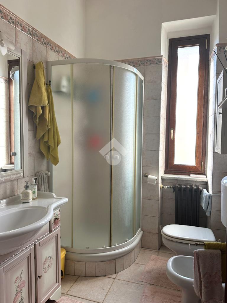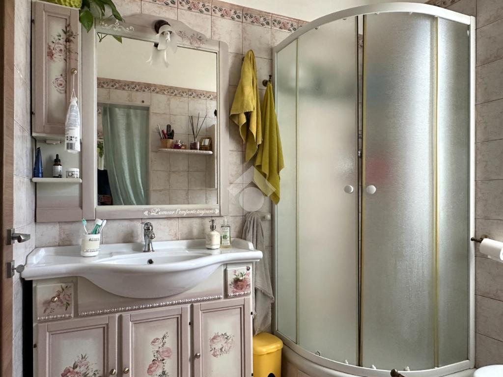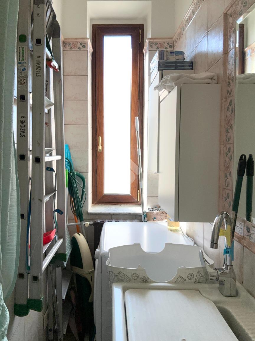Il bagno è finestrato e ristrutturato, completo di box doccia e affiancato da un pratico locale lavanderia separato.